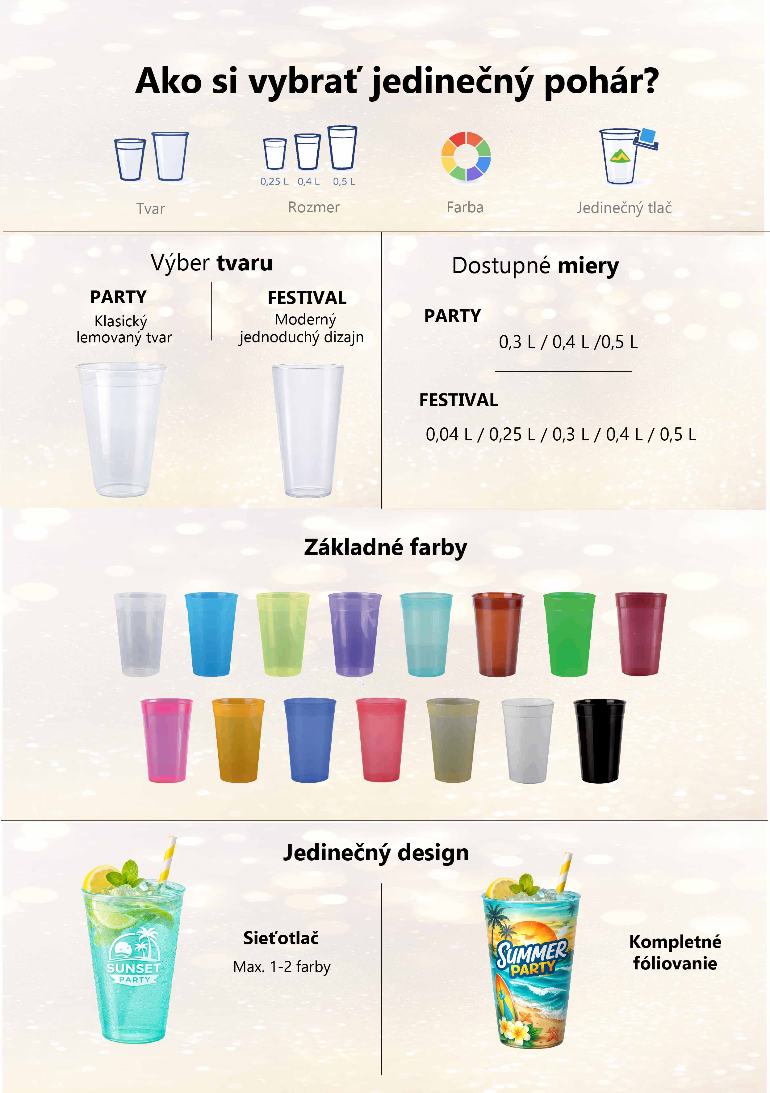 Vyrábame opakovane použiteľné poháre s individuálnym dizajnom v objemoch od 40 ml do 500 ml, s lokálnou potlačou loga alebo celoplošnou grafikou.